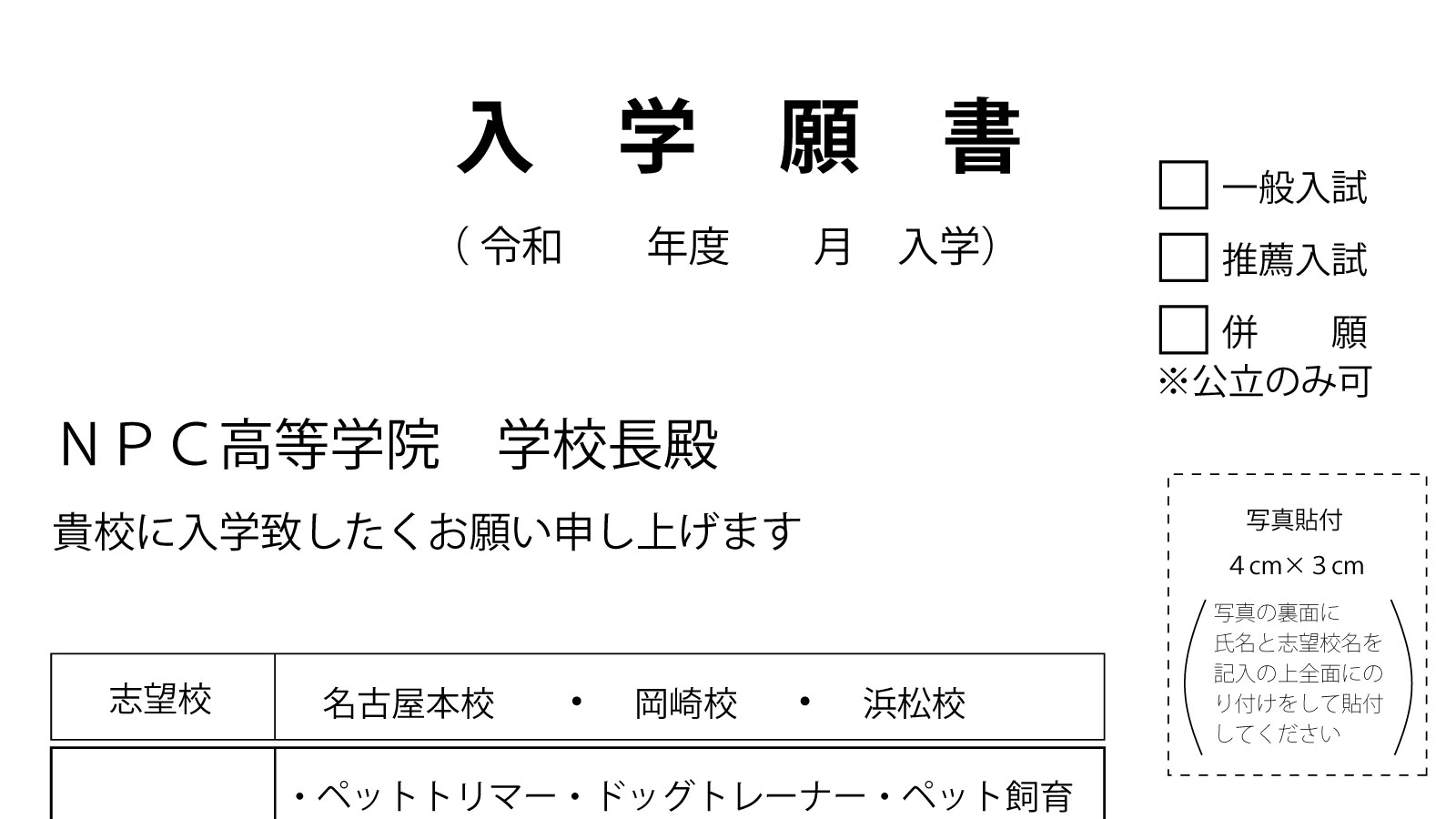 「中学校を卒業したけど、実はまだ高校が決まっていない・・・。」「今からでも間に合う高校はないかなあ・・・。」「来月から転校したいんだけれど」そんな悩みを抱えている方、ご安心ください!NPC高等学院では、転校、編入を毎月受け付けています。高校卒業資格が欲しいという方は「普通科」を、ペットの専門資格の取得も目指したい方は「ペット科」をオススメします